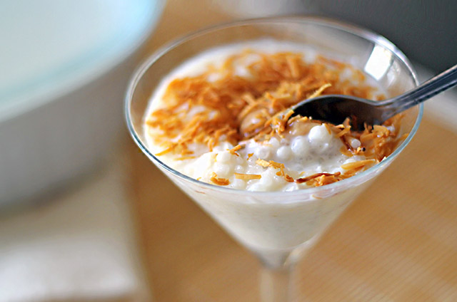A tapioca granulada necessita de ser hidratada (em água) durante várias horas antes de consumir - duplica o tamanho e fica com uma consistência gelatinosa.